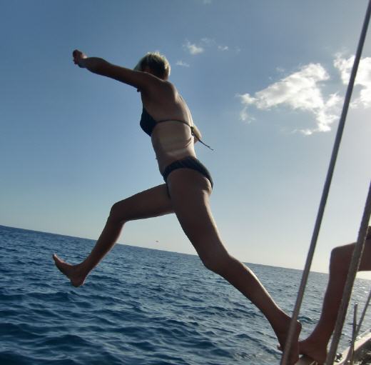 Endlich sind wir fertig! Wir wollen auch echt nur noch raus. Michael ist mittlerweile abgereist, - vielen Dank nochmal für deine tatkräftige Unterstützung,- und Claudia ist richtig eingezogen. Die Shangri La durfte in den Hafen umziehen und Dank Frank seiner anlegetechnischen Fähigkeiten auch heile anlegen. Jetzt hatten wir Wasser, um das Teakdeck zu reinigen und den Tank voll zu machen. Am Dienstag hieß es Leinen los, ab zu Tankstelle, Diesel bunkern und anschließend raus vor Anker. Jetzt endlich: Die Arbeit ist getan, das erste Ankerbier geöffnet und nun the first jump into the water! Nun sind wir angekommen, auf unserem Schiff und in dem großen Abenteuer, welches vor uns liegt. Kap Verde, bald sind wir da!