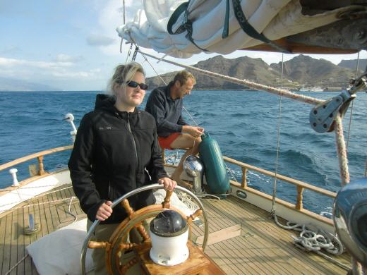 Unser Ingenieur, Koch, Mechaniker, Elektriker, Näher und Skipper Frank konnte die beiden Bäume mit einer eigenwilligen Selbstkonstruktion wieder am Mast befestigen. Um 9 Uhr war das Passatsegel auch schon wieder gesetzt und wir konnten unsere Fahrt mit Rückenwind fortsetzen. Wir hatten herrliches Segelwetter und schon bald stellte sich eine Bordroutine ein. Es wurde, wie immer auf der Shangri-La, ausgiebig gefrühstückt, gekocht, gebacken, gelesen, gesonnt und bei Nacht richteten sich unsere Blicke in den Sternenhimmel. Das Passatsegel sorgte für den Vortrieb und der Windpilot hat das Steuern übernommen. So hätte es gerne bis zu den Kapverden weiter gehen können, tat es aber leider nicht. Schon am Samstag wurde es immer ein wenig bewölkter und ab Sonntag haben wir dann mit Schauern, Böen und einer immer unruhiger werdenden See zu kämpfen. Auf unserer „Barfußroute“ hatten wir damit ab sofort nachts immer Schwimmwesten und Tagsüber auch mal ein paar dicke Socken an.