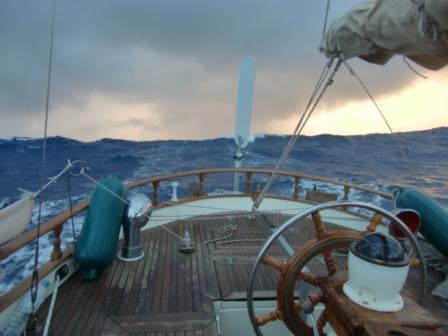 Um 0 Uhr hieß es dann:“ Segel bergen, Motor an!“ Bei Windstärke 6 mit Schauerböen von ca. 9 Beaufort und Wellengang bis zu 3 Meter mussten wir ein „Mann-über-Bord – Manöver “durchzuführen. Frank und Christine haben bei der Nachtwache ein blinkendes Licht auf Steuerbord gesehen Sofort wurde Claudia geweckt, die blitzschnell ihr Rettungsweste angezogen hat, für mehr war leider keine Zeit. Ein Blinklicht dicht über der Wasseroberfläche, auf hoher See? Treibt dort eine über Bord gegangene Person in ihrer Schwimmweste? Wir müssen nachsehen und so wenden wir schnellstmöglich. Das Licht stellte sich jedoch als eine Forschungsboje und eine gute Übung unter schwierigen Bedingungen für uns heraus. Das Passatsegel konnten wir nun jedoch wegen der schlechten Witterung nicht mehr setzen und außerdem wussten wir nicht, ob unsere schnelle Wendung das Segel heil überstanden hatte. Wir fuhren daher mit dem Klüver dem Sonnenaufgang entgegen. Nur mit dem Klüver waren wir immer noch mit 6 Knoten unterwegs. Knappe 12 Km/h sind an Land nicht besonders schnell, aber für ein Segelboot ist das eine ganz passable Geschwindigkeit und wenn der Speed dann auf neun oder sogar kurz über zehn Knoten steigt während wir in ein Wellental herabsausen, haben wir richtig Spaß. In dieser Nacht hatte Frank noch eine Begegnung der anderen Art. Ein kleiner sehr erschöpfter Vogel hatte auf der Shangri-La nach einem sicheren Zufluchtsort auf hoher See gesucht und Ihn auch selbstverständlich erhalten. Bis zum Morgen hat der Kleine auf unseren Cockpittisch geschlafen und sich durch nichts und niemanden stören lassen. Am folgenden Tag und auch in der Nacht haben wir es uns unter Deck so gemütlich wie möglich gemacht, die Umgebung mit dem Radar überwacht und nur wenn es unbedingt sein musste, einen Fuß an Deck gesetzt. Wir luften etwas an, um den Kurs zu halten und dadurch kam die See nun mehr von der Seite, was zur Folge hatte, dass immer wieder Wellen ins Cockpit schwappten und nicht selten ein Brecher lautstark übers Deck klatschte. Was einmal zur Folge hatte, dass Christines Koje nass wurde und komplett ausgewechselt werden musste. Naja, passiert. Ist eben Wassersport! Am nächsten Morgen besserte sich die Windsituation und wir fuhren unter kurzer Begleitung von Delfinen weiter in Richtung SSW.