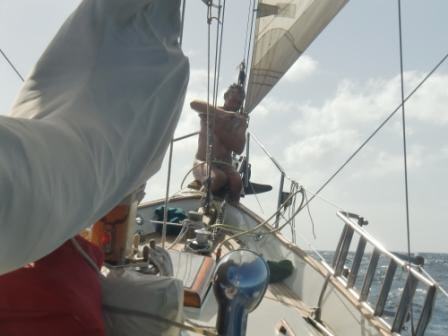 Auf einmal überraschte um ca. 5:30 ein heftiger Schlag auf das Vordeck Claudia und Frank und weckte Christine unsanft aus dem Schlaf. Frank schaltete sofort die Deckstrahler auf dem Vorschiff ein und wir erkannten, dass der Baumbeschlag mit dem die Passatsegelbäume am Mast befestigt sind, gebrochen war und die Bäume auf das Vordeck gefallen sind. Wir konnten das Segel und die Bäume sichern und sind erstmal eine kurze Zeit unter Motor weitergefahren um uns die genaue Schadenslage bei Hellem anzusehen.