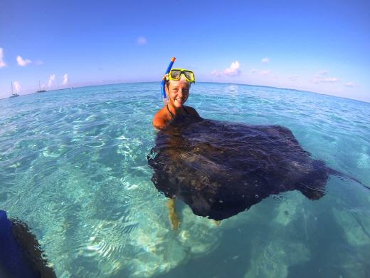 Am Eingang der Lagune ist eine Sandbank, auf der Stachelrochen schon vor 100 Jahren von Fischern angefüttert wurden. Heute übernehmen das die vielen Touristenboote, die jeden Tag mehrmals dort hinfahren. Einmal mit Rochen Schnorcheln, das wollen wir auch. Aber bitte ohne die Touristenmassen. Beim dritten Anlauf klappt es dann auch. Die ersten zweimal fuhren wir mit der Bonafide vom Ankerplatz zur Sandbank. Aber wir kamen jedes Mal zu spät. Am dritten Tag, die Bonafide hat die Nacht davor geankert, heben wir den Anker von unserem Platz und brechen um 6 Uhr morgens auf. Dieser Plan geht auf. Wir sind dort ganz alleine und Schnorcheln mit den wunderbaren Tieren. Einige sind sehr handzahm und kommen ganz nah an uns ran. So nah, das wir sie auf den Arm nehmen können. Sie mögen es ganz besonders, am Bauch gekrault zu werden. Dies ist schon ein ganz besonderes Erlebnis und dank der Unterwasserkamera von Andreas und Petra bekommen wir wunderschöne Bilder.