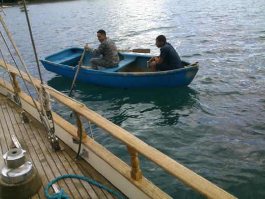 Ein junger Soldat schreibt in ein Buch unsere Namen und Passnummern, fragt woher wir kommen und wohin wir wollen. Dann rudert er wieder zurück zu der kleinen Pier, von der er gekommen ist. Er spricht sehr wenig Englisch, wir meinen aber, er hatte angekündigt, zurück zu kommen. Wir warten vergeblich. So lassen wir am Samstagvormittag unser Dhingi zu Wasser und fahren zum Land. Dort werden wir schon von Polizei und Armee erwartet, die uns erklären, dass wir nicht an Land dürfen. Baracoa sei kein internationaler Einreisehafen mehr. Wir können in der Bucht ankern, dürfen aber unser Schiff nicht verlassen. Wir können weder Diesel noch Wasser bunkern. Es bleibt uns nichts anderes übrig, als hier zu ankern und auf Wind zu warten. Wir schwimmen, waschen Wäsche, backen Brot und Kuchen. Zu tun gibt es immer etwas und irgendwann wird der Wind schon kommen. Unser einziges Problem ist, das unsere Vorräte an Wasser knapp werden. Sowohl im Tank als auch das Trinkwasser. Dieser Stopp war nicht eingeplant. Wir hatten etwas knapp kalkuliert und durch die unvorhergesehene Flaute kommen wir nun in Bedrängnis. Nach dem Wäsche waschen und der Dusche nach dem Schwimmen ist es dann soweit, der Tank ist leer. Allerdings kommt ein frischer Wind auf. Wir holen sofort mit dem Satellitentelefon den aktuellen Wetterbericht. Der Wind soll 36 Stunden bleiben und in der Nacht sogar noch auffrischen. Auch die Windrichtung aus Nord ist für uns optimal. Sollten wir doch noch Glück haben? Es sind 140 Meilen bis Santiago, ca. 28 Stunden, wenn der Wind uns nicht erneut verlässt. Es müsste eigentlich klappen, denn etwas Diesel haben wir ja noch. Wir heben den Anker und segeln los.