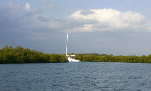 Die Gemeinde zählt 500 Einwohner und das Leben geht ruhig zu. Die Spanier treffen ein paar Stunden später ein und gemeinsam essen wir zu Abend. Kaum ist der Anker im Wasser bekommen wir überraschend Besuch. Überall in der Karibik kommen Fischer mit ihren Booten zu uns, um Lobster, Gemüse und Obst zu verkaufen. Den Kubanern ist strengstens verboten, den Fuß auf eine Segelyacht zu setzen, doch in Cabo Cruz ziehen sie sich Brille, Flossen und Schnorcheln an, verpacken ihr Gut wasserfest und schwimmen heimlich an unser Boot. Sie haben Eier, Obst, Gemüse und Lobster im Angebot. Außerdem bieten sie noch an, das Unterwasserschiff und den Propeller zu reinigen. Am nächsten Tag fahren wir mit unserem Dhingi zum Riff, um dort selbst zu Schnorcheln. Uns offenbart sich eine traumhafte Unterwasserwelt mit bunten Fischen und Pflanzen. Zum ersten Mal auf unserer Reise schnorcheln wir an einem Riff und sind total begeistert. Unsere weitere Reiseroute führt uns nach Niquerro, eine Kleinstadt geprägt von Landwirtschaft und Fischfang. Schon von Ferne erkennen wir den qualmenden Schornstein der Zuckerfabrik. Hier versorgen wir uns noch einmal mit Lebensmitteln, da wir in den nächsten Tagen nur Ankerplätze vor winzigen Inseln aufsuchen werden. Am späten Abend des 23.03. erreichen wir unseren ersten Ankerplatz im Golfo de Annamaria. Kaum ist der Anker im Grund bekommt Christine starke Magenkrämpfe, Durchfall und muss sich schließlich übergeben. 24 qualvolle Stunden liegen vor ihr, bis es langsam besser wird. Wir hatten in Niquerro tiefgefrorenes Mett gekauft und daraus leckere Frikadellen gebraten. Nach dem Würzen hatte Christine die Rohmasse abgeschmeckt. Vermutlich war das die Ursache für ihr Leiden. Wenigstens haben wir für die Zeit der Genesung einen ruhigen Ankerplatz. In den darauf folgenden Nächten im Golfo de Annamaria ist das Ankern weniger gemütlich. Rundum geschützte Buchten gibt es nicht. So ankern wir immer im Lee einer Insel und hoffen, dass der Wind in der Nacht nicht dreht. In der Nacht zum 26.03. tut er es jedoch, 24h früher als vom Wetterdienst angekündigt. Wir werden unsanft geweckt. Das Schiff hat sich gedreht und in der mittlerweile stärker werdenden Dünung setzen wir immer wieder leicht auf Grund. Jetzt aber raus aus den Federn! Der Anker muss hoch, wir müssen hier weg! Hoch am Wind segeln wir nach Trinidad. Fünf Nächte in der einsamen Wildnis sind uns genug, wir wollen schließlich Kuba erleben. Die Marina von Trinidad ist in unserem Hafenführer kaum erwähnt. Es heißt nur, die Einfahrt ist tricky! Man sollte lieber nach Cienfuegos ausweichen und von dort Trinidad mit dem Taxi besuchen. 50 Meilen weiter segeln und dann mit dem Taxi zurückfahren? Tricky heißt schließlich nicht unmöglich. Und so nehmen wir Kurs in die Bucht von Casilda. Tief in der Bucht zweigt ein kleines Fahrwasser zur Marina Trinidad ab. Wir sehen Masten, aber keine Schiffe. Die Marina ist umgeben von Mangroven in einem winzigen Naturbecken.
