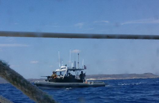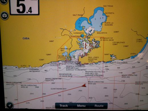 Durch die voran gegangene Flaute ist die See noch glatt und der Wind treibt uns gut vorwärts. Nur dass er in der Nacht auffrischen soll, hat er wohl vergessen. Um Mitternacht schläft er ein und die Segel beginnen zu schlagen. Wir dümpeln noch bis 5 Uhr früh, dann schmeißen wir den Motor an. Gegen Mittag bekommen wir dann auflandigen Wind. Wenn sich die Landmasse erhitzt, steigt die Warme Luft darüber auf und wie beim Kamin, wird Luft von den Seiten angesogen. Mit diesem thermischen Wind erreichen wir über 5 Knoten Fahrt. Um das Phänomen gut auszunutzen segeln wir relativ dicht an der Küste. Was zur Folge hat, das wir das Sperrgebiet vor Guantanamo Bay soeben etwas touchieren. Dies löst bei den Amis große Aufregung aus! Über Funk werden wir aufgefordert, sofort auf Südkurs zu gehen und den vorgeschriebenen Abstand zu dieser berüchtigten Militärbasis einzuhalten. Damit wir uns nicht verfahren, schicken sie uns auch noch ein Schnellboot mit schwer bewaffneten Soldaten. Irgendwie sind die nicht zum Spaßen aufgelegt – unser freundliches Winken wird jedenfalls nicht erwidert. 15 Minuten dauert diese Eskorte, dann dreht das Boot wieder ab. Wir bleiben noch etwas auf Südkurs und funken dann die US Coastguard an, um nachzufragen, ob der Abstand angenehm ist. Obwohl wir schon deutlich außerhalb des Sperrgebietes sind, werden wir freundlich aufgefordert, noch eine halbe Meile weiter Süd zu laufen. Dann können wir wieder auf Westkurs gehen.