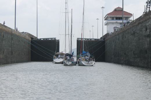 Kurz vor der Schleuse bilden wir ein Päckchen mit zwei anderen Seglern. In die Mitte nehmen wir einen etwas untermotorisierten 38‘ Katamaran, wir gehen an seine Steuerbordseite und auf Backbord macht das dritte Segelboot fest. Langsam manövrieren wir unser Päckchen in die erste Schleusenkammer. Dabei steuern wir fast ausschließlich mit den Maschinen. Geben wir mit der Shangri La einen Schub vorwärts, so drehen wir uns nach links, stoppen wir auf, so drehen wir nach rechts. Der Katamaran hat ohnehin zwei Motoren, jedoch mit unseren 14 Tonnen an seiner Seite, kann er alleine nicht viel ausrichten. Den kleinen Segler an Backbord nehmen wir dabei einfach mit, er braucht nichts zu tun.