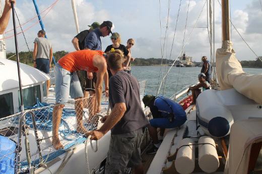 17. Februar 2015 Es geht tatsächlich los. Um 12 Uhr kommen unsere Leinenhänder an Bord. Aufgrund der vielen Terminverschiebungen sind wir auf professionelle Helfer angewiesen. Diejenigen, die gerne mal zum Spaß mit uns durch den Kanal fahren wollten, konnten nicht so oft ihre Pläne ändern. Um 13 Uhr rufen wir `Christobal Signal Station` über Funk an, um mitzuteilen, dass wir nun Club Nautico verlassen und uns zur Warteposition für Sportboote begeben.