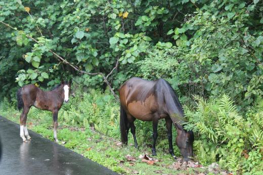 Am nächsten Tag mieten wir zusammen mit Sebastian, Steffen und Gloria von der SY Axiom ein Auto und erkunden die Insel. Nur selten übersteigt die Tachonadel die 40km/h, dann wird Steffen auch schon ermahnt, nicht so zu rasen! Wir tuckern gemütlich zu entlegenen Dörfern, historischen Ruinen, schönen Aussichtspunkten und zu guter Letzt zum Supermarkt. Wann haben wir schon mal den Luxus unsere Einkäufe mit dem Auto zu erledigen? Am allermeisten sind wir von der Fauna und Flora begeistert. Hibiskusbäume mit ihren riesigen Blüten stehen neben Bananenpflanzen, Palmen wechseln sich mit Nadelbäumen ab. Überall ist es grün, in ganz unterschiedlichen Farbnuancen. An der Strasse sind Kühe und Pferde angebunden, die friedlich grasen. Ziegen und natürlich Hühner laufen überall frei herum.