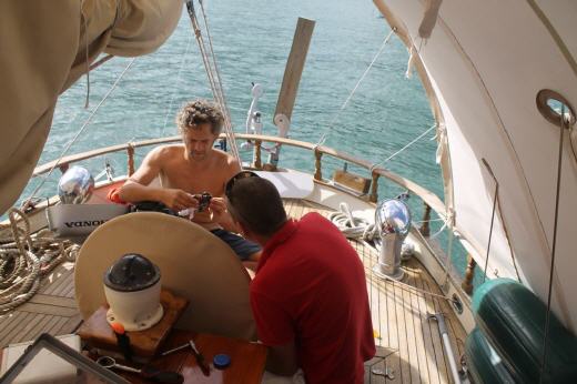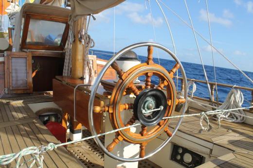 Und wenn es Nacht ist, brausen wir im leuchtenden Plankton dahin. Die Farben, die wir zu sehen bekommen, könnten auch aus einem Hollywoodstreifen stammen. Der Alltag auf See fällt uns immer leichter und so gehen uns Dinge wie Brot und Kuchen backen, Abwaschen und Kochen ganz gut aus der Hand. Leider soll die ungetrübte Freude nicht lange andauern. Denn plötzlich läuft die Shangri La aus dem Ruder, die Windfahne geht auf Abfallen, aber nichts passiert. Das Pendelruder unserer Windsteueranlage ist abgebrochen und in den Tiefen des Ozeans versunken. Vor uns liegen noch 2600 Seemeilen, die wir auf keinen Fall von Hand steuern wollen. Glücklicherweise haben wir ein geeignetes Brett und die Werkzeuge, um uns ein neues Pendelruder zu bauen. Selbst unser betagter Stromgenerator springt auf Anhieb an. Und so ist das Problem schnell aus der Welt. Drei Tage hält der Frieden mit der Steuerung bis eine Schweißnaht an der Steuerpinne reißt und Diese unbrauchbar macht. Auch dieses Problem können wir lösen. Aus einer Angelrolle bauen wir uns einen Adapter aufs Steuerrad, zwei Umlenkrollen befestigen wir an der Reling, dann wickeln wir eine Leine um die Angelrolle und verbinden sie mit den Steuerseilen unseres Windpiloten. Es funktioniert prima und wir segeln bis heute mit dieser Lösung. Immer öfter stellen wir fest, dass das Segeln bei so einer Tour eher nebensächlich ist, sondern es viel mehr auf die handwerklichen und improvisatorischen Geschicke ankommt.