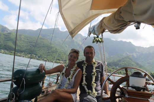 Leider ist uns am letzten Tag auf See ein kleines Missgeschick passiert, welche aber eine große Wirkung nach sich zog. Unser Motor springt nicht mehr an. Aber da wir ja ein Segelboot sind, kreuzen wir solange hin und her, bis wir dem Ankerplatz näher kommen. Ein befreundeter Segler, Pascal, sieht uns und kommt mit seinem Dinghy zu Hilfe. Er schiebt uns durch das ganze Ankerfeld bis ganz nach vorn und dort fällt der Anker. Die Wiedersehensfreude ist groß, denn schon auf Galapagos haben wir eine schöne Zeit miteinander verbracht. Auch die Besatzung von der SY Axiom kommt mit ihrem Dinghy und bringt uns für das Abendessen frisch gefangenen Thunfisch. Es könnte uns kaum besser gehen, wäre da nicht diese Reparaturliste. Das Klüverfall ist gerissen, zwei Segel müssen genäht werden und der Motor streikt. Glücklicherweise können wir alles selbst reparieren und nach zwei Tagen Arbeit ist unser Schiff wieder fit, aufgeräumt und sauber. Eine Woche bleiben wir auf Fatu Hiva. Wir wandern zum Wasserfall, schwimmen in der Bucht und erholen uns. Danach segeln wir nach Hiva Oa und reisen offiziell in französisch Polynesien ein. Das Einklarieren ist französisch Einfach und kostenlos. Am Ankerplatz treffen wir viele alte und neue Bekannte.