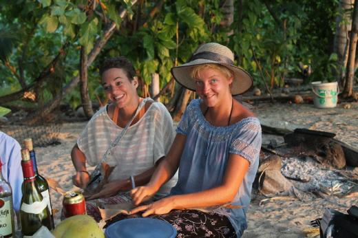 Nur wenige Meilen von Hiva Oa entfernt liegt die Insel Tahuata, an deren Westküste es eine Traumbucht geben soll. Gemeinsam mit der Axiom machen wir uns auf den Weg und nach nur zwei Stunden segeln, fällt unser Anker vor einem traumhaften Sandstrand. Das Wasser ist kristallklar und allmorgendlich schwimmen riesige Manta Rochen um unsere Boote. Als Steffen und Sebastian zum Zeitvertreib mit ihrem Dinghi in der Bucht kreuzen und angeln, fangen sie einen Wahu, den wir abends am Strand gemeinsam mit den Einheimischen auf traditionelle Weise zubereiten und verspeisen. Dieses Gericht heißt poisson cru und ist roher Fisch in Kokosmilch. Aber nicht die Kokosmilch aus der Konservendose, sondern von der Palme aus dem eigenen Garten. Gloria und Christine bekommen den Auftrag, mit einem Rindenblatt, die Kokosflocken auszupressen, bis nur noch die Milch übrig ist. Zum Glück für uns Europäer wird ein Großteil des Fisches auch gegrillt, aber probiert haben wir trotzdem. Wir essen mit 20 Personen von diesem Fisch und bekommen ihn nicht alle. Wir verbringen noch einige schöne Tage dort mit Schnorcheln und geselligen Sundownern, bis wir uns aufmachen und zur nächsten Insel segeln.