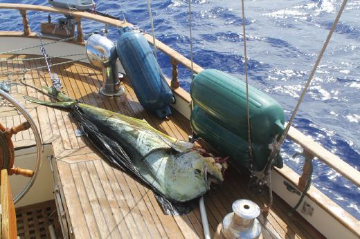 Die 380 Seemeilen nach Niue verlaufen mehr oder weniger ereignislos. Frohen Mutes probieren wir den neuen Köder von Bob aus. Und tatsächlich, am zweiten Tag ruckt es ganz heftig am Gummiband. Frank hat sich gerade zum Schlafen gelegt, als Christine plötzlich „Fisch“ schreit! Wir drehen sofort bei, um an Fahrt zu verlieren. Frank holt die Leine ein und Christine legt alles bereit. Gaff, Eimer, Alkohol zum betäuben, ein Messer und Leinen. Da sehen wir ihn aus dem Wasser springen. Ach du sch..., denken wir! Ist der groß und schön! Ein ausgewachsener MahiMahi hängt am Haken. MahiMahi ist die polynesische Bezeichnung für Goldmakrele. Frank hat ganz schön zu kämpfen, doch Stück für Stück zieht er ihn ran. An Bord steht Christine mit der Gaff bereit, Frank gießt Alkohol in die Kiemen und tötet den Fisch mit einem gezielten Stoß ins Herz. Da dieses Exemplar sehr groß ist. Unser Maßband zeigt knapp 1,50m, binden wir ihn zum Ausbluten an der Reling fest. Insgesamt bekommen wir 10 kg Fischfilet heraus. Wir bedanken uns bei Neptun und geben die Reste zurück ins Meer. Nun heißt es, die Filets in Dosen zu verpacken und den Kühlschrank immer am Laufen zu halten. So kommt es, das wir dreimal am Tag und einmal in der Nacht eine Motorstunde machen, damit die Batterien voll bleiben.
