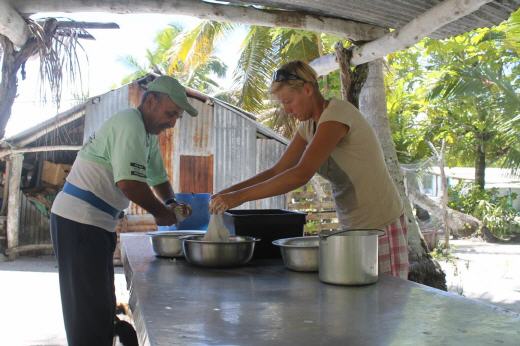 Mit jedem Tag bekommen wir mehr das Gefühl dazu zugehören und so beschließen wir, am Sonntag mit unseren Gastgebern den Gottesdienst zu feiern. Früh um neun Uhr werden wir von Eduard und John abgeholt. Normalerweise rasen sie mit ihrem Alu Boot übers Riff und im Slalom durch die Korallenköpfe in der Lagune. Nicht am Sonntag! Heute geht es in Schleichfahrt zur Insel, um die sonntägliche Ruhe nicht zu stören. Wir trinken noch ein Tässchen Kaffee und dann gehen wir mit Simon, Eduards Bruder, zur Kirche. Es wird viel gesungen und in der Predigt werden wir sogar namentlich erwähnt. Pastor Marsters wünscht uns alles Gute und Gottes Segen für unsere Reise. In der Zwischenzeit haben Eduard und seine Söhne das Mittagessen zubereitet. Seine Mutter, die Oma des Hauses, ist 86 Jahre alt und mehr oder weniger bettlägerig. Vor dem Essen setzen wir uns alle um ihr Bett und beten gemeinsam das Vaterunser. Danach gibt es Mittagessen. Hühnchen in leckerer Soße mit Reis und Gemüse. Wein und Nachtisch haben wir mitgebracht. Vanille und Schokopudding, der so gut ankommt, dass uns Eduard eine große Schale mit an Bord gibt, um noch einmal Pudding für ihn zu kochen. Nach dem Mittagessen spannen wir unsere Hängematten im Schatten zwischen den Palmen und fallen in einen tiefen und erholsamen Schlaf. Danach gehen wir ein letztes Mal über die Insel, um uns zu verabschieden. Bill lässt es sich nicht nehmen uns Proviant für die bevorstehende Reise zu schenken. Wir bekommen Brot, Eier, Speck, Würstchen, Zwiebeln und Kartoffeln mit den Worten: „On sea is no supermarket!“ Und natürlich essen wir noch eine große Portion Eiscreme mit Bill Clinton.
