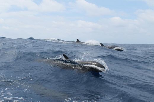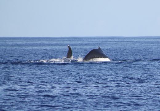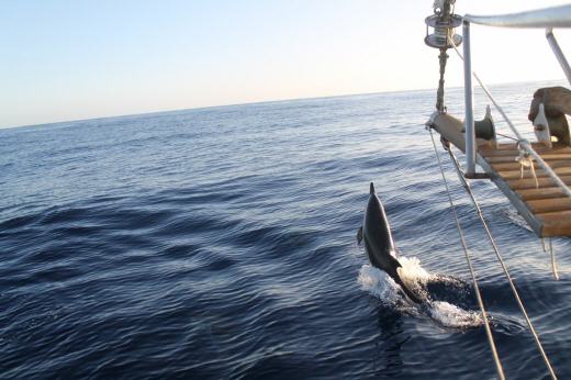 Einige Tage später bekommen wir Besuch. Eine große Herde Wale begleitet uns über eine Stunde lang. Dabei sind sie so dicht am Boot, dass sie uns manchmal ihren feuchten Atem ins Gesicht blasen. Ein paar von Ihnen schlagen in der Luft Purzelbäume, während Andere ihren Nachwuchs bei Fuss haben. Immer wieder tauchen sie von Backbord nach Steuerbord, vom Bug zum Heck. Im Schiff hören wir die markanten Geräusche, als scheinen sie sich gegenseitig zuzurufen. Es ist einfach unbeschreiblich. Wir sind begeistert und zehren noch viele Tage von diesem tollen Erlebnis.