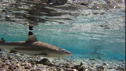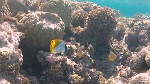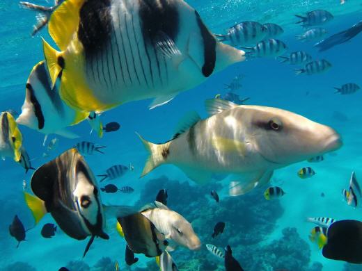 Zurück an Bord ziehen wir uns sofort Badesachen, Brille und Flossen an. Das Wasser sieht fabelhaft aus. Hellblau, Türkis, Sattblau und Dunkelblau, je nach Tiefe des Wassers. Swimmingpoolcharakter. Nicht weit von der Shangri La ist ein Korallenriff, welches wir erschnorcheln wollen. Wir sprechen uns ab, einmal im Uhrzeigersinn rum. Es ist zwar nur ein kleines, aber hier sehen wir den wirklichen Reichtum der Tuamotus. Die Unterwasserwelt ist einfach fantastisch. Große Fische, kleine Fische, gestreifte, gepunktete, bunte Fische. Dazu große Venusmuscheln, Weichkorallen, Schnecken und bunte Fächerwürmer. Und dann, - die erste Begegnung mit einem schwarzspitzen Riffhai. Er dreht sofort ab als er uns sieht, aber unser Erschrecken war nicht minder groß. Wahnsinn, schnorcheln ist hier ein Traum. Nach einer Stunde wärmen wir uns bei einem Shangri La- Cappuccino wieder auf.