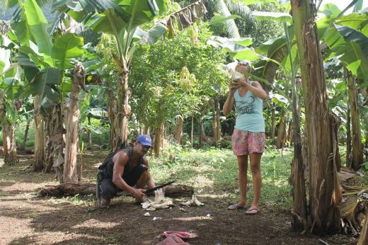 Mittags sind wir bei Bob zum Essen eingeladen. Es gibt frisch gefangene Kokosnusskrabben mit Reis. Das Fleisch der Tiere schmeckt super und für ist das eine völlig neue Erfahrung.