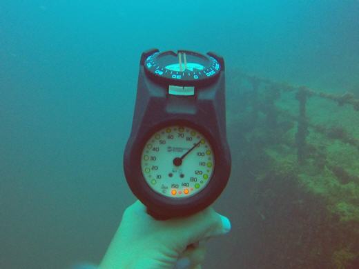 Normalerweise tauchen wir nur Nullzeittauchgänge, also maximal auf 20m Tiefe, weil wir weder einen Tauchcomputer noch eine Uhr haben. Aber Klaus kommt auch mit und er trägt seinen Tauchcomputer für uns alle am Handgelenk. Nun geht es los in die unglaubliche Pracht der Unterwasserwelt. Wir gehen an einer Leine runter und sehen erst mal nichts. Bis dann auf 25m Tiefe die ersten Relingsstützen schemenhaft zu erkennen sind. Doch dieser Moment währt nur kurz. Oben brechen die Wolken auf und die Sonnenstrahlen erreichen nun endlich auch dieses Schiff, welches wie verzaubert aussieht. Unglaublich, welche Farben und Formen wir sehen. Das Wrack ist komplett bewachsen. Es sieht aus, wie bei einem Festumzug, geschmückt mit vielen Blumen und Muscheln. Und natürlich ist es auch ein wenig unheimlich, ein Schiff so zu sehen. Unwillkürlich kommen da Gedanken in den Kopf „hoffentlich betauchen wir mal nicht so die Shangri La!“ Aber das ist schnell überwunden und wir machen uns auf den Weg. Wir gucken durch die Bullaugen ins Innere und sehen Fische dran vorbeiziehen. Es ist, als ob wir in deren Wohnzimmer schauen. Sogar die Schraube ist noch da und Klaus stellt sich genau da drunter für ein Foto! Hoffentlich passiert jetzt kein Erdbeben und wir sind darunter begraben! Aber alles bleibt gut und wir ziehen weiter. Nach 45 min sind wir einmal herum. In der Literatur steht, dass man eigentlich für das komplette Schiff zwei Tauchgänge braucht. Wir betauchen es in einem! Christines Finimeter zeigt nur noch 65 bar an. Ob das noch für den Dekostopp reicht? Da wir über 30min auf 35m Tiefe getaucht sind, zeigt Klaus Tauchcomputer eine Dekozeit von 12min auf 5m an. 12Min können ganz schön lang sein, besonders da wir an der Leine hängen und nichts zum Gucken haben. Das nächste Mal nehmen wir ein Skatspiel mit! So langsam geht Christine dann doch die Luft aus. Also bekommt sie erst den Oktopus von Frank und dann nochmal für 5 min den von Klaus. Endlich gibt der Computer sein ok und wir können auftauchen. Ach, das war schön!