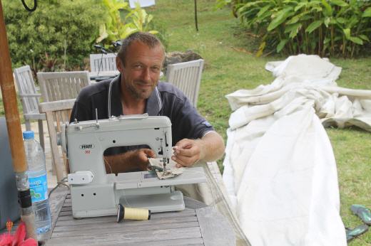 Wir finden sogar einen Tauchshop, der bereit ist unsere Flaschen für wenig Geld zu füllen. Hier in der Vava’U Group gibt es unzählige Tauchspots, die in diverser Literatur beschrieben werden. Da uns aber noch das Nähen der Segel bevorsteht, decken wir uns mit Lebensmitteln ein und fahren zurück zum Hotel Resort. Auf der Terrasse rattert die Nähmaschine und aus kaputt wird neu! Wir sind echt begeistert von unserer Arbeit, das es so gut wird, hätten wir nicht gedacht. In insgesamt drei Tagen messen wir ab, schneiden, kleben und nähen wir Klüver und Groß. Der Klüver ist bis auf das Vorliek aus einem komplett anderen Segel entstanden und beim Groß konnten wir das Achterliek und die entstandenen Risse mit den Resten des anderen Segels reparieren. Wir sind Joseph und Renate total dankbar, wenn sie nicht so großzügig ihre Segel und ihren Platz angeboten hätten, könnten wir jetzt nicht ohne Probleme weitersegeln.