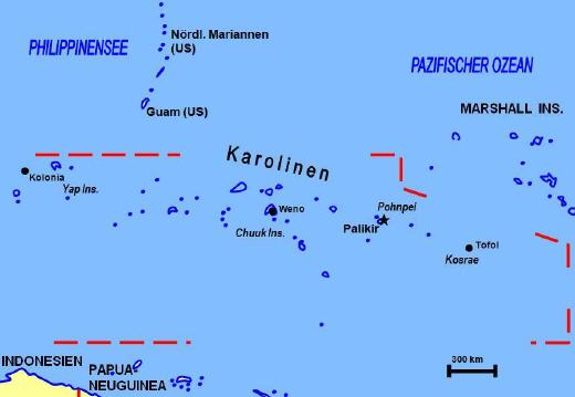 Etwa um 1899 herum beschloß unser Kaiser Wilhelm, dass es doch förderlich wäre, im Pazifik Inseln zu besitzen. Desalb kaufte er nach langen Verhandlungen die Inseln Kosrai, Pohnpei, Chuuk, Yap und Palau dem spanischen König ab. Doch 1914 verloren wir diese Inseln an die Japaner, welche bis zum Ende des zweiten Weltkrieges dort die Besatzung übernahm und einen grausamen Raubbau an der Bevölkerung und dem Land vornahmen. Immer wenn uns ein Mikronesier fragt, wo wir denn herkommen und unsere Antwort „from Germany“ lautet, erscheint ein Lächeln auf dem Gesicht und die Erwiderung, dass mindestens ein Vorfahr aus der Familie deutsch war und sogar auch einen deutschen Namen trägt.