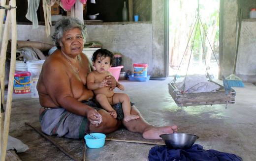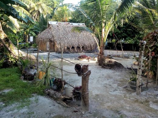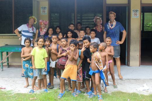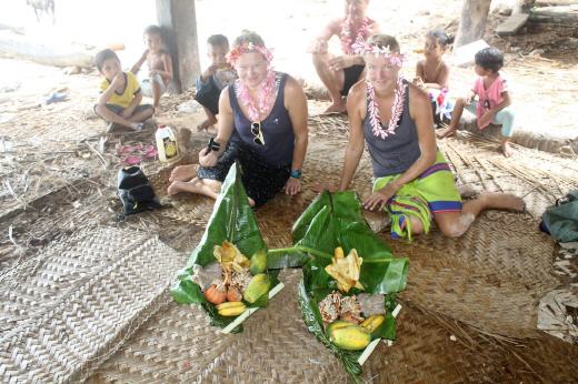 Die Begrüßung an Land erfolgt durch den Chief. Sein Name ist Mana. Doch leider bedauert er, dass heute keine Zeit sei, uns eine offizielle Begrüßungszeremonie zukommen zu lassen, weil sie durch das Versorgungsschiff beschäftigt sind. So verabschieden wir uns wieder und verabreden uns für morgen. Wir sind auch noch sehr müde, die 336 Seemeilen stecken uns noch in den Knochen. Ausgeschlafen und voller Motivation packen wir unseren Rucksack mit kleinen Geschenken, wie Zucker, Kaffee und Süßigkeiten und fahren einen Tag später wieder rüber. Chief Mana kommt uns schon von Weitem entgegen und bittet uns unter dem Versammlungshaus Platz zu nehmen. Hier sitzen die Männer in Gruppen zusammen oder liegen in den Hängematten. Manche haben ihre Kinder dabei und spielen mit Ihnen. Chief Mana stellt sich und die anderen Männer vor und kurz darauf, bringt er uns Frauen fort vom Männerhaus zum Frauenplatz. Oh, denken wir, hier wird noch nach Geschlechtern getrennt. Patricia und Christine sitzen also nun in der Küche, trinken Kaffee und spielen mit den Kindern, während sich Frank und Djidji mit den anderen Männern unterhalten. Aber nach kurzer Zeit werden wir wieder zusammen geführt und der Rundgang durchs Dorf beginnt. Chief Mana´s Tochter übernimmt die Führung. Sie zeigt uns die Schule und stellt uns den Lehrer vor. Es gibt eine Klasse mit Kindern unterschiedlichen Alters, unterrichtet werden die Fächer Englisch, Mathe, Geographie, Geschichte und auch Sport und traditionelle Sachen, wie Blumenkränze flechten und Palmblattdächer winden. Die Schule ist ausgestattet mit einem Kurzwellenfunkgerät, der einzige Kontakt zur Außenwelt. Nun geht es weiter und wir besichtigen das Dorf. Wir schauen die Hütten an und sind ein wenig erstaunt. Der Fußboden ist eine Betonplatte, die Wände und das Dach sind aus natürlichen Materialien. Geschlafen wird auf dem Boden, die Bambusmatten sind ordentlich aufgerollt. Die Kinderbetten bestehen aus einer Art Schublade, die hängend von der Decke baumeln und mit einem Moskitonetz geschützt sind. Alle persönlichen Dinge sowie Lebensmittel sind sicher vor Ratten und Mäusen aufgehängt. Die Küche ist separiert, draußen unter einem Dach. Alles ist sehr einfach gehalten. Die Kinder spielen draußen mit selbstgebastelten Spielzeug. Und vor allem, sie spielen miteinander und wenn es mal Streit gibt, lösen sie es untereinander. Niemand braucht einen Fernseher oder anderes elektronisches Gerät,um sich die Zeit zu vertreiben.