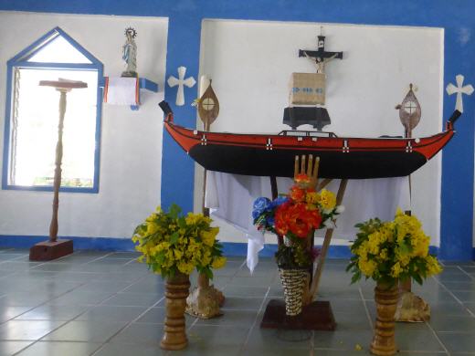 Nach 78h davon 30h mit Handsteuern erreichen wir das Elato- Atoll. Auch hier arbeiten wir mit unseren Satellitenbildern. In der Lagune liegt das Versorgungsschiff, welches 4 mal im Jahr alle Outer Islands ansteuert, um die Bewohner mit Gütern zu versorgen. Als wir ankern, herrscht reger Bootsverkehr zwischen dem Schiff und dem Örtchen. Ebenso werden auch Passagiere transportiert. Wir beobachten Abschieds- und Begrüßungsszenen. Unser Dinghy ist ebenfalls abfahrbereit und auch Djidji und Patricia sitzen in ihrem Beiboot, um an Land zu fahren. Elato ist seit langem mal wieder ein Atoll mit türkisfarbenen Wasser, weißem Sandstrand und einer Menge Palmen, die bis ans Wasser reichen. Wunderschön sieht es aus. Zwischen den Palmen lugen Palmblattdächer hervor und hier und dort steigt eine Rauchwolke auf. Wir bersten vor Neugier dieses Atoll zu besuchen. Die Bewohner aller äußeren Atolle von Yap sollen noch auf sehr traditionelle Art und Weise leben. Die Frauen und Männer gehen „oben Ohne“ mit nur einem speziellen Tuch um den Intimbereich gewunden. Natürlich hat auch hier die Kirche gute Arbeit geleistet und alle Bewohner sind christlichen Glaubens. Später werden wir eine Kirche besichtigen und staunen, dass es doch funktioniert, die traditionelle Art mit dem christlichen Glauben zu kombinieren. Der Altar zeigt ein Kanu mit einem Kreuz und die Kirchgänger gehen oben ohne in die Kirche.