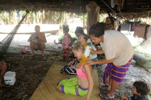 Die Stoffe, die die Frauen um ihre Hüften geschlungen haben, stellen sie selbst her und nennen sich LavaLavas. Es sind selbst gewebte Stoffe, die ein wenig wie „Ikea Teppiche“ aussehen. Auch der Prozess des Webens wird uns vorgeführt. Nun werden wir wieder zum Frauenplatz zurück geführt und wie soll es auch anders sein!, zeigen uns die Damen bereits fertige LavaLavas und bieten sie uns zum Kauf an. Christine begeistert sich für die bunten Stoffe und hat sich auch schon einen ausgesucht. Da kommt Chief Mana um die Ecke und fordert uns alle auf im zu folgen. Die beiden Frauen Patricia und Christine sollen sich LavaLavas umlegen und wir alle vier sollen unsere T- Shirts ausziehen. Die Bikinitops dürfen sie aber anbehalten! Nun startet die Begrüßungszeremonie. Unsere Dekolletés, Nacken und Schultern werden mit einem gelben Pulver eingerieben und zum Schluss kommen noch pinke Punkte auf die Stirn und Wangen. Jetzt murmelt der Chief zu jedem von uns Wörter in seiner Sprache und fertig ist die Zeremonie! Es ist uns nun offiziell erlaubt, die Insel zu betreten und in der Lagune zu ankern.
