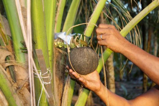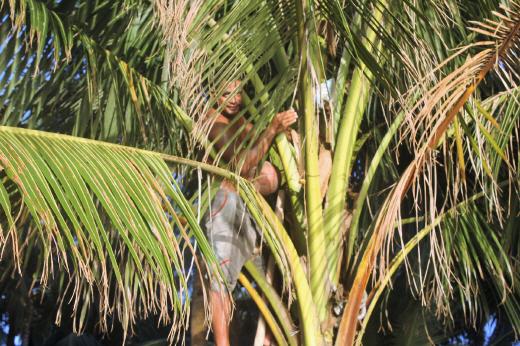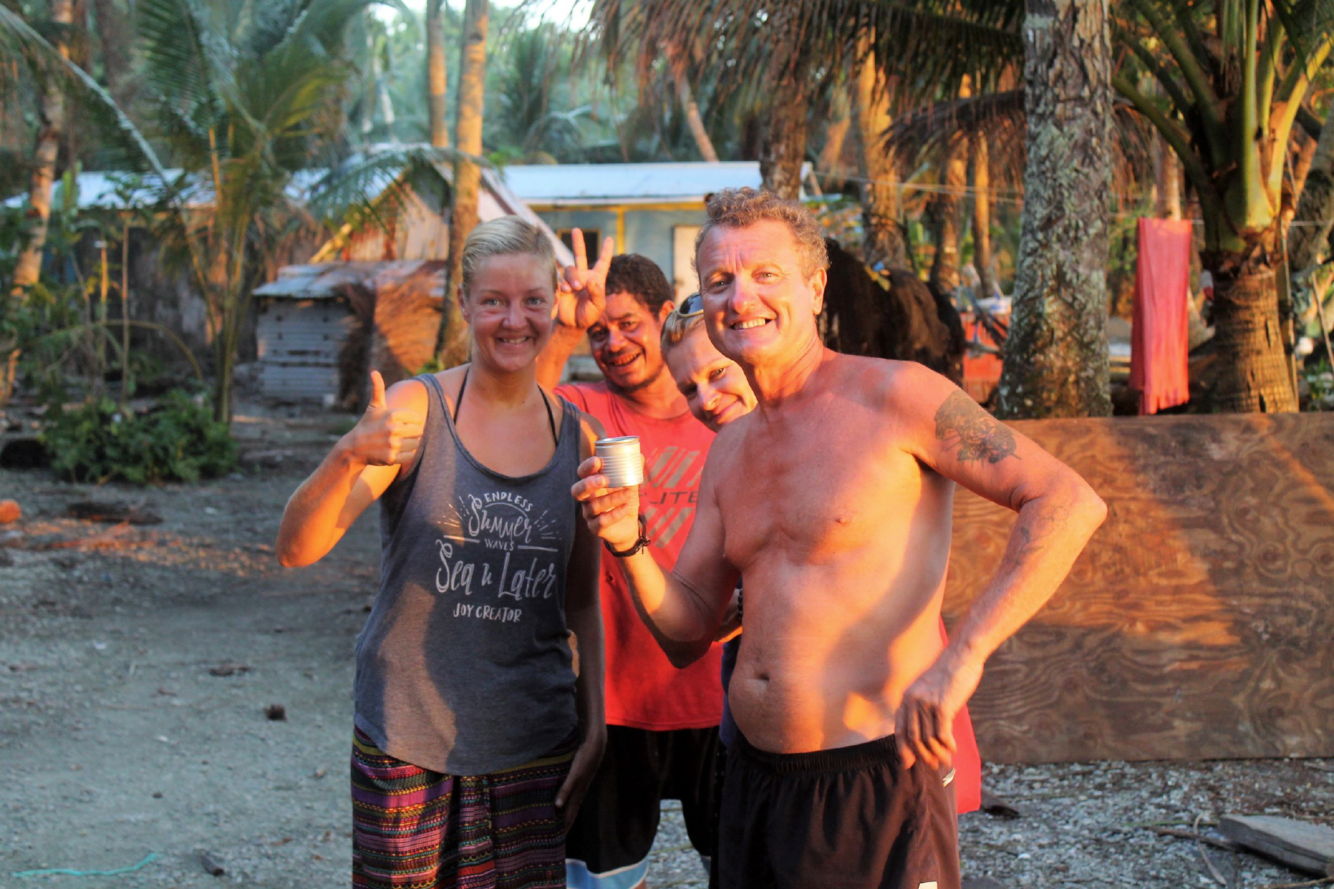 Punkt 15 Uhr sehen wir Männer aus ihren Häusern und vom Strand kommen. Jeder mit einer Flasche oder einem Krug in der Hand und mit einem klarem Ziel vor Augen. Die Männer klettern auf unterschiedliche Palmen und machen etwas, was wir nicht klar erkennen können, dann kommen sie wieder runter und ihr Gefäß ist auf wundersamer Weise mit einer Flüssigkeit gefüllt. Alles in allem verstreicht eine Stunde, bis sie sich alle unter dem Männerhaus wieder treffen. Der Chief erklärt es uns. Morgens sucht sich ein Bewohner eine Palme aus, klettert sie rauf, schneidet ein junges Palmblatt an und bindet ein Gefäß unter die Öffnung. Der Palmsaft tritt aus und fermentiert in der Flasche zu Tuba, örtlicher Name für Palmwein. Um drei werden die Flaschen dann geerntet und durch leere Flaschen ersetzt. Um 17 Uhr fängt die zweite Runde des Erntens an, sodass um 18 Uhr alle bereit sind, im Männerhaus zu sitzen und sogenannte Meetings abzuhalten. Frauen sind dabei nicht zugelassen. Aber da wir Besucher sind, die auch einiges an Geschenken mitgebracht haben, wird für Patricia und Christine eine Ausnahme gemacht. Wir sind herzlich eingeladen, am Meeting teilzunehmen. Wir würden es als Stammtischrunde bezeichnen. Einfach Männer, die zusammen sitzen und trinken. Dabei läuft sogar Musik und getanzt wird auch! Auch wird uns feierlich ein Becher mit Tuba gegeben, doch so richtig überzeugt uns der Geschmack nicht, doch aus Höflichkeit trinken wir mit.
