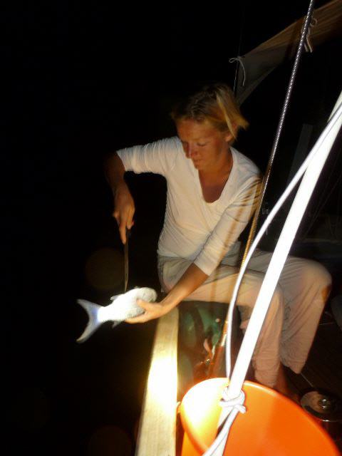Wir können uns nicht vorstellen, hier jemals wieder abreisen zu wollen. Ist das Wasser doch sehr klar und es scheint ein kleines Paradies zu sein. Doch leider kommt am nächsten Tag der Chief vorbei und sagt, dass wir bis zum Mittag den Platz verlassen müssen, weil dann ein Touristenboot kommt, auf denen sie den Besuchern den Schein einer verlassenen Insel wahren wollen! Soviel dazu! Aber wir wollen sowieso weiter. Die erste Insel der Yasawa-Gruppe schaffen wir noch. Hier geben wir zum ersten Mal Kava an den Chief des Dorfes und so haben wir die Erlaubnis, sein Dorf zu betreten und einen kleinen Rundgang zu machen. Unser Guide Nessy führt uns durchs Dorf. Zum Schluß bietet er uns an, mit Katja und Christine zum Speerfischen zu gehen. Aber erst, wenn es dunkel ist. Natürlich sagen wir da nicht nein und um sieben Uhr holen wir in mit unserem Dinghy ab. Es ist schon unglaublich, wie lange er die Luft anhalten kann, um dann einen Fisch zu schießen!
