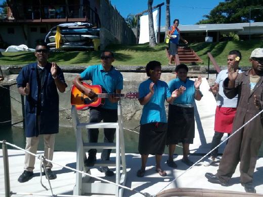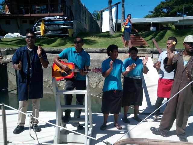 Um neun Uhr werden wir über Funk aufgefordert den Anker zu heben und zum Quarantänedock in der Marina zu kommen. Dort wartet nicht nur der Zoll, sondern auch noch fast das gesamte Marina Personal, um uns ein Willkommensständchen zu singen. Wir sind total gerührt – Bula!