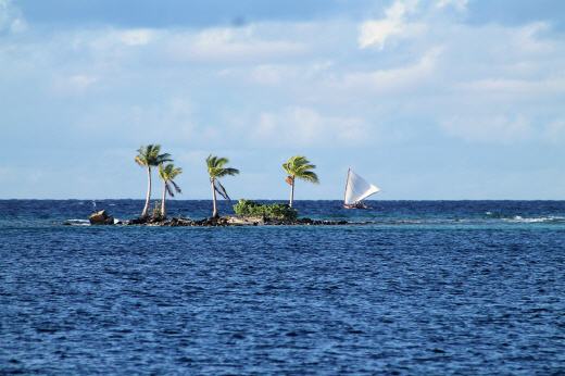 Nach nur 105 Seemeilen erreichen wir Ifalik. Auch hier steht die Realität mit den Seekarten in keinerlei Zusammenhang. Unser Plan ist aufgegangen und wir sind am Mittag, wenn die Sonne am höchsten steht am Eingang zum Atoll. Doch leider müssen wir noch ein einen kurzen Regenschauer abwarten, wir können unsere Hand vor Augen nicht sehen! In gewohnter Manier – Frank am Steuer und Christine auf dem Klüverbaum – manövrieren wir langsam durch den schmalen Eingang des Atolls. Es dauert nicht lange und wir werden von den Inselbewohnern entdeckt. Sie rudern uns entgegen, um uns den Eingang zu zeigen. Der ist, dass müssen wir zugeben, sehr schwierig, weil wir Zickzack fahren müssen. Mittlerweile zählen wir an die Zwanzig Kanus, die uns begleiten. Jeder winkt und ruft Begrüßungsworte zu uns herüber. Im Konvoi begleiten sie uns zu unserem Ankerplatz. Als der Anker fest sitzt, kommen sie zu uns ans Schiff und begrüßen uns freudig. Wir fühlen uns, als ob wir die ersten Fremden überhaupt wären, aufgrund eines solchen Aufgebotes. Nachdem wir einige Geschenke verteilt haben, sind wir auch bald wieder für uns. In Richtung Bug der Shangri La ist eine kleine Landzunge, dort sind insgesamt drei Dörfer. Schauen wir übers Heck, sind dort nur kleine Mini- Inseln und das Riff, welches aber überspült ist. Wir können endlos weit gucken. Und dort auf der Außenseite am Riff, kreuzt ein traditioneller Segeleinbaum. Fischer, auf Ihrem Weg nach Hause.