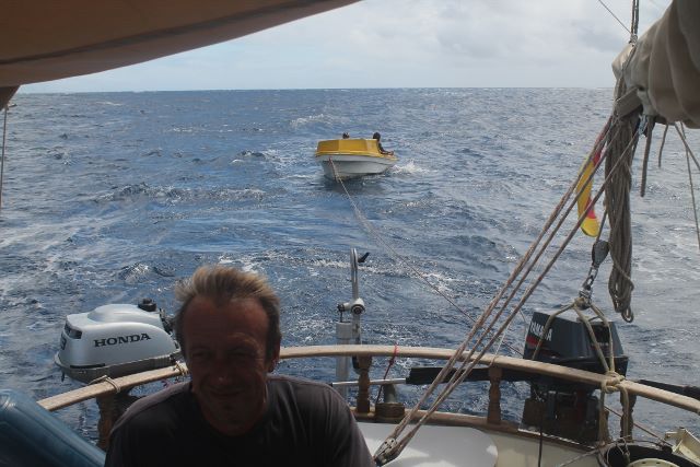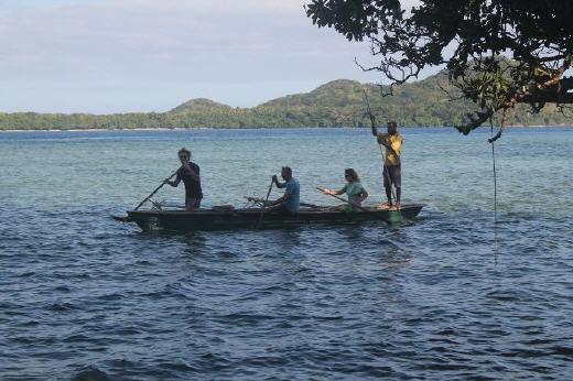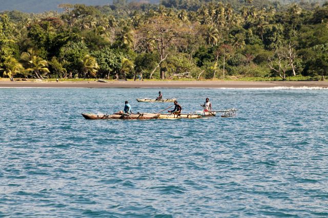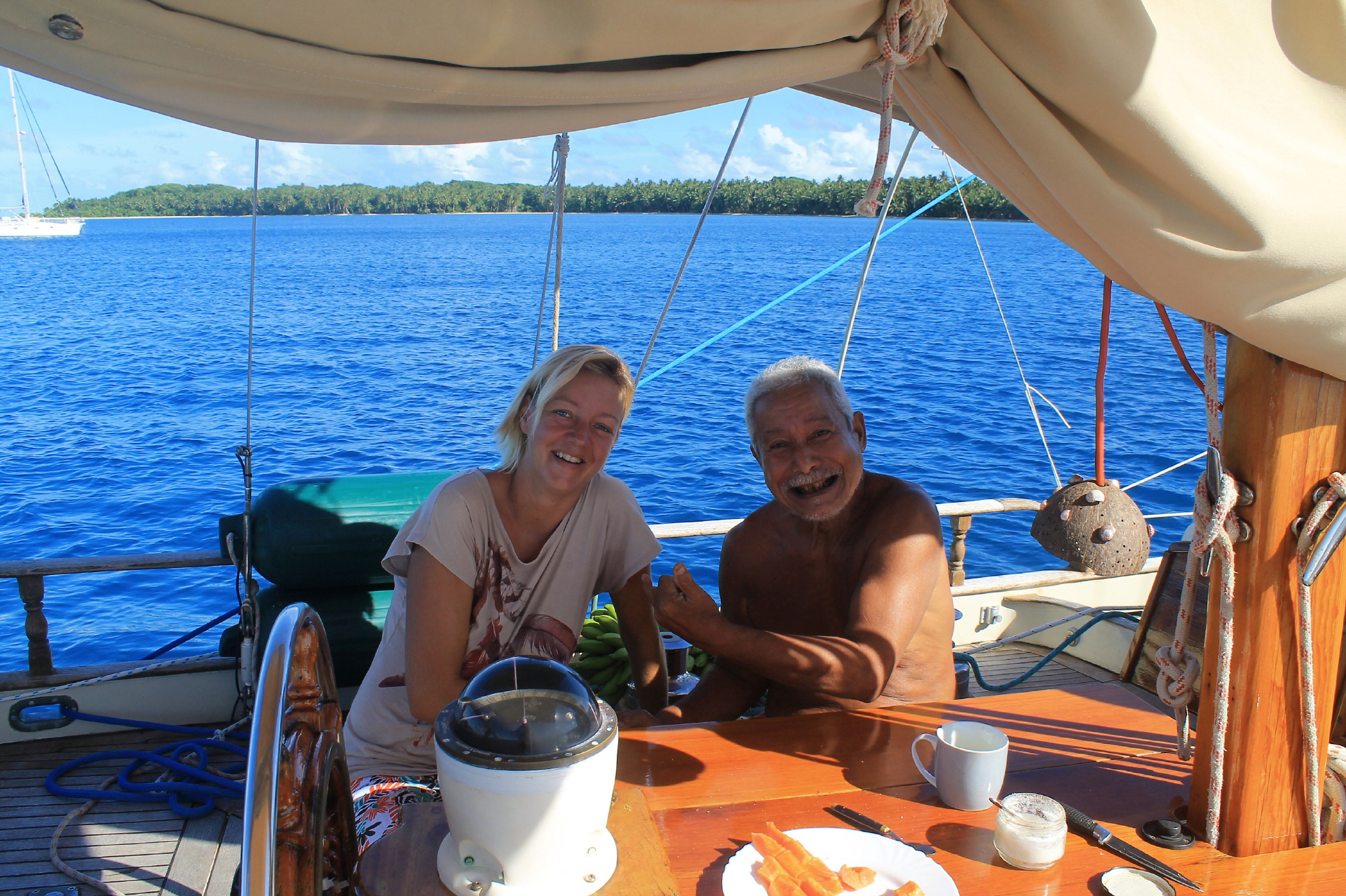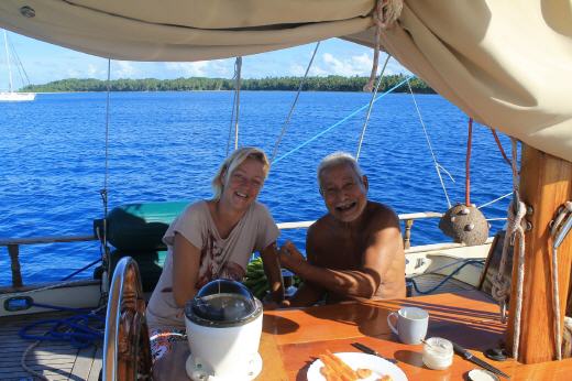 Da wir müde von der Überfahrt sind, auch hier mussten wir wieder mit Hand steuern, da der Wind eingeschlafen ist, wollen wir ein kurzes Nickerchen halten, bevor wir an Land gehen. Doch nach kurzer Zeit klopft es an der Bordwand. Der Chief des Dorfes wurde von seinem Neffen zu uns rüber gebracht. Wir laden ihn ein an Bord zu kommen und zu einer Tasse Kaffee. Er erklärt uns, was wir beachten müssen, wenn wir an Land sind. Ebenso ist es Sitte, Geschenke mitzubringen. Wir sagen ihm, das noch ein Schiff hierher unterwegs ist und wir dann zu viert an Land kommen. Genau in diesem Moment kommt die Donnazita, ebenfalls begleitet von einigen Kanus. Der Chief ist ja ganz nett und es ist auch wirklich lustig, ihn an Bord zu haben, dennoch sind wir froh, dass er nun auch Djidji und Patricia begrüßen möchte. Wir sind doch ganz schön ko!