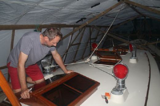 Beide Masten werden abgezogen, kleine Risse mit Epoxy repariert, geschliffen und erhalten einen neuen Lackanstrich. Also insgesamt 10 mal lackieren mit zwischen schleifen.Der Tauchkompressor wird eingebaut. Dies erfordert Franks Technikkenntnisse, er wird über unseren Dieselmotor gesetzt und von Diesem mit einem Keilriemen angetrieben. Die Luken werden abgezogen, geschliffen und 10 mal lackiert. Die Seitenwände vom Deckhaus werden abgezogen, geschliffen und 10 mal lackiert. Das Deckhaus wird geschliffen und neu lackiert. In der Vorschiffskabine müssen die alten Holzseitenteile durch neue Oberflächen ersetzt werden. Das was Holz bleibt, wird neu lackiert. Der Kühlschrank bekommt eine neue Arbeitsplatte. Die Kühlschrankfront wird ebenfalls durch eine neue Oberfläche ersetzt. Lecks werden, so gut es geht, mit Sikaflex abgedichtet. Das Namensschild wird über lackiert Das Deck wird gewaschen und geölt. Der Windgenerator wandert in den Müll. Der verursacht zu große Schäden am Besanmast. Wir bekommen ein neues Toplicht. Wasserpass höher setzen und die ersten 20 cm mit Hardantifouling streichen. Ausbesserungen am Rumpf mit Spachtel, schleifen und neues Antifouling. Neues Wellenlager Und viel viel Kleinkram, alles können wir hier gar nicht auflisten!