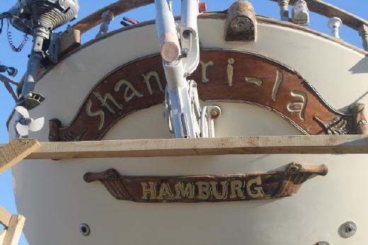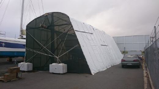Nun beginnt das Leben auf einer Werft. Die Shangri La steht auf dem Trockenen und ohne die beiden Masten. Als erstes Projekt, welches ca. einer Woche dauert, bauen wir ein Zelt um unser Schiff. Manche nennen es „Kirche“, andere wieder „Haus“ oder „Plastikpalast“ und manche sagen gar nichts, sondern gucken nur erstaunt und mit großen Augen! Insgesamt verbauen wir 540m Holzlatten, 240 m² Siloplane und ca. 150m PE- Rohr für die Dachkonstruktion!