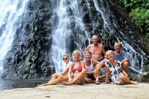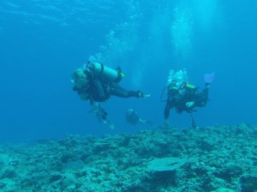 Danach segeln wir weiter zur Hauptinsel der Vanuatus und ankern in Port Vila, in unmittelbarer Nachbarschaft zur "Pazific Hope" einem alten, umgebauten Fischerei-Ausbildungsschiff, mit dem meist europäische Ärzte und Zahnärzte zu entlegenen Dörfern fahren, um dort ehrenamtlich die Menschen zu behandeln. Der ebenfalls ehrenamtlich fahrende Kapitän Klaus, war Lotse im Hamburger Hafen, und so kommt es, dass er mit seinem Beiboot stoppt, als er am Heck der Shangri La sieht, dass ihr Heimathafen Hamburg ist. Wir freunden uns schnell an und wie üblich kommt die Frage nach dem Beruf. Kannst du schweißen???!!!!! Schon ist Frank angeheuert und verbringt die nächsten Tage mit Flex und Schweißgerät. Seit Fiji segeln wir mit der Segelyacht „Fernweh“ zusammen. An Bord wohnen Bernd und Heike, zwei Ärzte aus Deutschland. Beide sind begeisterte Pferdemenschen und finden es grandios, dass ein Hufschmied eine Weltreise unternimmt. In der Zeit, in der Frank auf der „Pazific Hope“ arbeitet, unternimmt Christine mit Bernd und Heike einen Reitausflug zu einem wunderschönen Wasserfall. Heike ist ebenfalls Taucherin und die „Donazita“ mit Patricia und Djidji sind angekommen, die auch beide Taucher sind. Da Tauchen in der Gruppe immer sicherer ist und wir den Tauchkompressor an Bord haben, sind wir ab sofort ein dreier Konvoi. Zum Glück haben wir auch mehr oder weniger die gleiche Reiseplanung, also gibt es darüber nicht so viele Diskussionen! Im Gegensatz zu Fiji, können wir im Süden von Vanuatu einklarieren, um dann im Norden wieder auszuklarieren. Es liegt also alles auf dem Weg und mit der Windrichtung. Das macht es leichter, eine Route zu kreieren. Immer wenn Zeit war und wir gutes Internet hatten, hat Christine schon mal über gute Tauchplätze recherchiert. Und wenn an unserem Ankerplatz kein Spot eingetragen ist, dann schnappen wir uns unsere Maske und suchen uns selber ein schönes Riff. So tingeln wir langsam von Tanna nach Efate, von dort nach Emae und zum Cook Reef. Auf der Nordwestseite vom Cookreef soll der beste Tauchspot von ganz Vanuatu sein. Da überlegen wir natürlich nicht lange und fahren mit der Shangri La raus. „Shangri La Adventure Tours!“ Dort kann man nicht ankern, also teilen wir uns zwei Gruppen auf. Christine, Djidji und Heike als Erstes und dann folgen Frank und Patricia. Bernd wird zum Steuermann erklärt und fährt mit der Shangri La im Kreis, solange bis die rote Boje auftaucht. Für uns Taucher ist das ein super Gefühl, denn man muss nicht aufpassen, wo man runter gegangen ist und wo man wieder auftaucht.