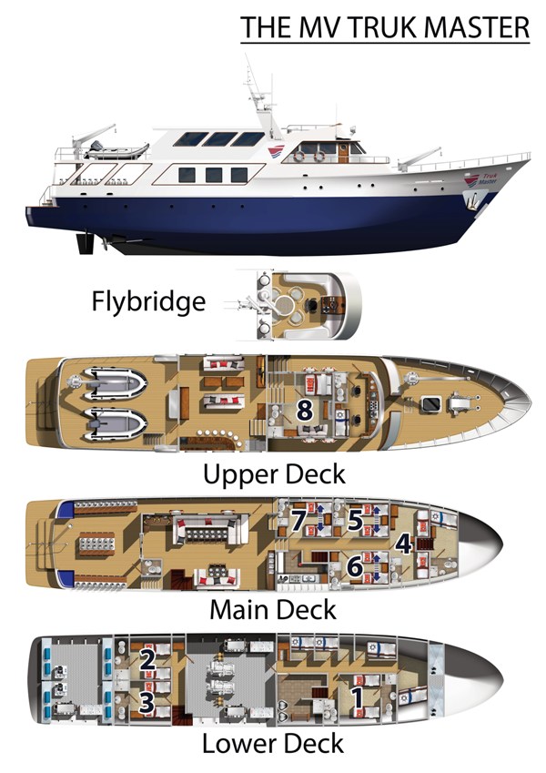 Wir sind mittlerweile wieder gesund und wollen nun auch endlich mal wieder unter Wasser. Frank will den Termin mit der örtlichen Tauchschule bestätigen. Doch er kommt mit schlechten Nachrichten wieder. Angeblich wissen sie nichts mehr von einem Termin und die nächsten Tage haben sie auch gar keine Zeit für uns, denn sie sind voll ausgelastet. Na super, das ganze Warten war umsonst. Da aber sogar die Nummerschilder der Autos den Beinamen „Divers Haven“ tragen, müssen wir unbedingt da runter! Ebenfalls hinter uns liegt ein luxuriös aussehendes Tauchschiff. Da der erste Captains Talk schon so gut funktioniert hat, macht sich Frank auf zu einem Zweiten. Und tatsächlich! Freudestrahlend kommt er wieder und verkündet die frohe Nachricht: Morgen folgen wir der Truk Master und wir bekommen unseren eigenen Guide für nur 5 US Dollar pro Person! Das ist ja mal ein Ding! Am nächsten Tag geht’s los! Wir ankern ein wenig entfernt, denn nur die Tauchschiffe dürfen an den Moorings festmachen, die an den Wracks befestigt sind. Sofort kommt das große rote Dinghy zu uns rüber und bringt uns zur Truk Master. Und schon fängt der Luxus an. Die eigentliche Gäste, welche hier 4000,-€ pro Woche zahlen, sind bereits unter Wasser und das Personal steht nun uns zur Verfügung. Während des Briefings werden uns gekühlte Getränke serviert und unser Equipment zurecht gelegt. Dann geht es richtig los. Anstatt uns selber anzuziehen, bekommen wir Hilfe! „Ma'am, your BCD, please give me your right arm... now the other one... Ma'am, please your finns... Ma'am, please your Divecomputer.... Und so weiter. Das war ganz schön merkwürdig, so bedient zu werden. Aber alles ist vergessen, sobald wir den Atemregler im Mund haben und schnell auf 35m absinken. Dort liegt ein wunderschön bewachsendes Wrack, ein Frachtschiff befüllt mit alten Fässern, Flugzeugen, und alles was so ein Schiff an Bord hat. Wir sehen im Schein unserer Taschenlampen Geschirr, einen vorzeitlichen Außenbordmotor und leere Flaschen. So wie das Schiff vor Anker gelegen hat, ist es auch gesunken.