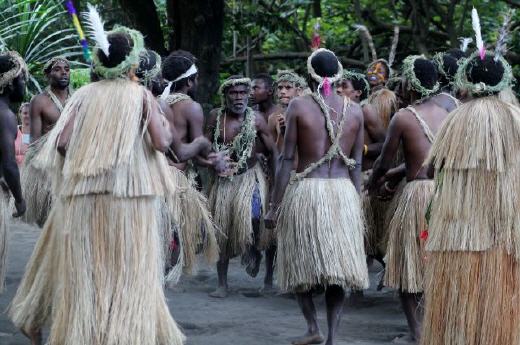 Die Einheimischen kommen uns in ihren Einbäumen besuchen und fragen nach Tauschware. So tauschen wir T-Shirts, Kaffee und Zucker gegen Tomaten, Frühlingszwiebeln und Papayas. In Vanuatu gibt es viele unterschiedliche traditionelle Tänze und Riten, meistens vorgeführt vor hunderten von Touristen für viel Eintrittsgeld. Dies ist für uns nichts, wir wollen keine „Zirkusshow für Touris!“, also bleiben wir solchen Sachen fern. Aber der Chief von diesem Ort, bietet uns ein ganz privates, kleines Festival an. Einmal für uns und zum Anderen, damit die Kinder die traditionellen Tänze und Riten lernen. Da sagen wir natürlich zu. Wir können nur sagen: Wow! Wir dachten, da wird ein bisschen getanzt und gesungen und das war es! Nein! Sie haben sich richtig Mühe gegeben. Hier müssen wir das erste Mal wirklich sagen, schaut euch das Video auf YouTube an, erst dann kann man verstehen, was wir meinen. Sie haben uns gezeigt, wie sie kochen, wie die Palmblätter für den Häuserbau geflochten werden, den Frauentanz, den Männertanz und die Watermusic. Am Ende wurden wir zum Essen eingeladen und Cava mit uns getrunken. Es war der beste Geburtstag von Christine!!!!