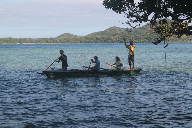 Am nächsten Tag spielen wir Taxi für die Männer im Ort. In einem Dorf auf der Nordseite von Gaua findet ein Kirchenfestival statt und sie fragten, ob wir und die Donazita sie dorthin bringen könnten. Das haben wir nicht besser gewusst und sagten natürlich ja! Wir nehmen also 4 Passagiere auf und haben noch das Dorfeigene Motorboot für den Rückweg im Schlepp. In diesem Boot sind noch mal zwei Männer plus ein lebendes Schwein, das sie dort schlachten wollen. Als wir dann um die Ecke fahren, bläst uns der Wind auf die Nase und eine meterhohe Welle wirft uns auf und ab. Mit vollen 2000 Touren fahren wir nur 2 Knoten! Nach 5 Stunden gegen an motoren, kommen wir endlich dort an und verabschieden unsere Mitfahrer.