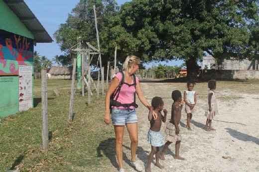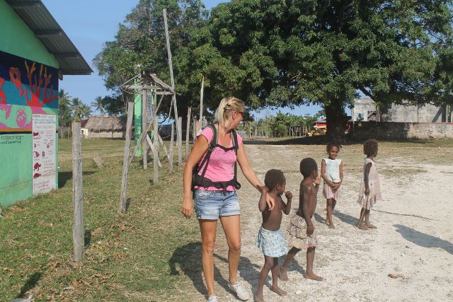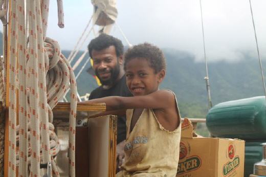 Abends verabschieden wir uns mit Lagerfeuer und Getränken von Bernd und Heike, sie segeln runter nach Australien. Wir heben den Anker und segeln weiter zum Port Sandwich. Laut Hafenhandbuch gibt es dort Wasser, unser Tank ist nämlich fast leer und geregnet hat es auch lange nicht. Als wir dort ankommen sehen wir die Betonpier: Völlig verrottet und verfallen, hier hat lange kein Schiff gelegen. Wir beschließen mit dem Dinghy an Land zu fahren und wenigstens zu fragen. Giji und Patricia schließen sich uns an. Doch als wir anlanden, sehen wir Kühe auf Wiesen grasen und ein paar Hühner vorbei laufen, aber keine Menschenseele die wir fragen könnten. Da sagte Gigi zu uns, kein Problem, sie hätten auf der Fahrt hierher 120l Wasser mit ihrem Wassermacher gemacht, die könnten wir haben. Und am nächsten Tag gerne nochmal so viel! Super, dann hätten wir dieses Problem ja gelöst! Wir gehen noch ein wenig hier spazieren und kommen zum nächsten Ort. Dort läuft uns schon eine Kinderschar entgegen und sofort hat Christine an jeder Hand zwei kleine Kinderhände! So oft bekommen sie dort keinen Besuch von Touristen, dementsprechend groß ist die Freude.