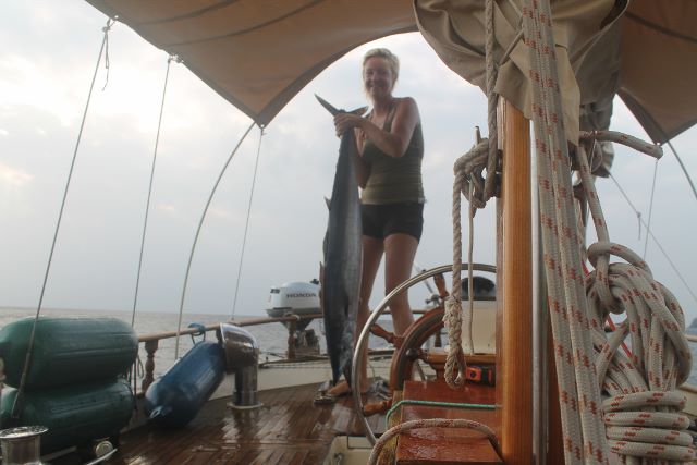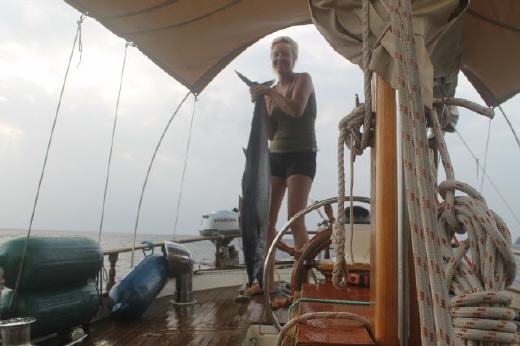 Wir verbringen noch einige Tage auf Espiritu Santo an der Ostküste, ankern vor einem Fluss der zu einem Blue Hole führt und helfen der Donazita, die einen kaputten Propeller hat. Frank und Gigi tauchen und wechseln den Propeller unter Wasser. Mit dem Dinghy fahren wir den Fluss hoch und schwimmen im saubersten Süßwasser. Im Blue Hole kommt das Wasser direkt aus der Erde. Eine riesen große Badewanne! Da wir doch ein wenig unter Zeitdruck stehen, heben wir den Anker und segeln zur Insel Gaua. Wir ankern vor einem Ort, der uns 100 Jahre in die Vergangenheit führt. Die einzige Möglichkeit, für die Bewohner Besuch zu bekommen oder weg zu fahren, führt über den Seeweg. Und so sind sie sehr erfreut, dass wir dort ankern. Insgesamt sind wir drei Schiffe, Donazita, Tara und wir. Wir hatten wieder richtig Glück, ein 1,50m großer Wahoo biss in unseren Köder! Den haben wir gleich in Stücke geschnitten und gesmokt! Das ist unser Reiseproviant nach Mikronesien, abgegeben haben wir natürlich auch!