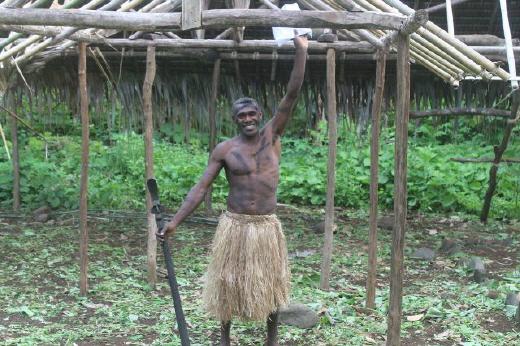 Bevor es zum Kraterrand geht, müssen natürlich erst noch die Götter besänftigt werden. Also wird dem Oberhaupt des Stammes erstmal eine riesige Kava Wurzel überreicht und dann werden traditionelle Tänze aufgeführt. Naja, der aufgebrühte Kava Sud macht zwar den Häuptling glücklich, aber der Toyota läuft damit nicht und die Handyrechnung..., also sind nochmal ca. 100,-€ pro Nase fällig, bevor es zum Kraterrand geht.